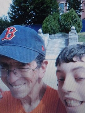 Tom Roberts’ great-great grandson and great-great-great grandson, Lance Bennett and his son Preston Bennett shown in front of Eastern Connecticut State University. In the background can be seen the exquisite stone spheres that grace the stairs of the university along Valley Street and are said to have been carved by “Big Tom Roberts”, respectively their 2 times and 3 times grandfather, who was also a stone mason. Windham/Willimantic, CT. Photo courtesy of Lance and Preston Bennett 8/19/2018
