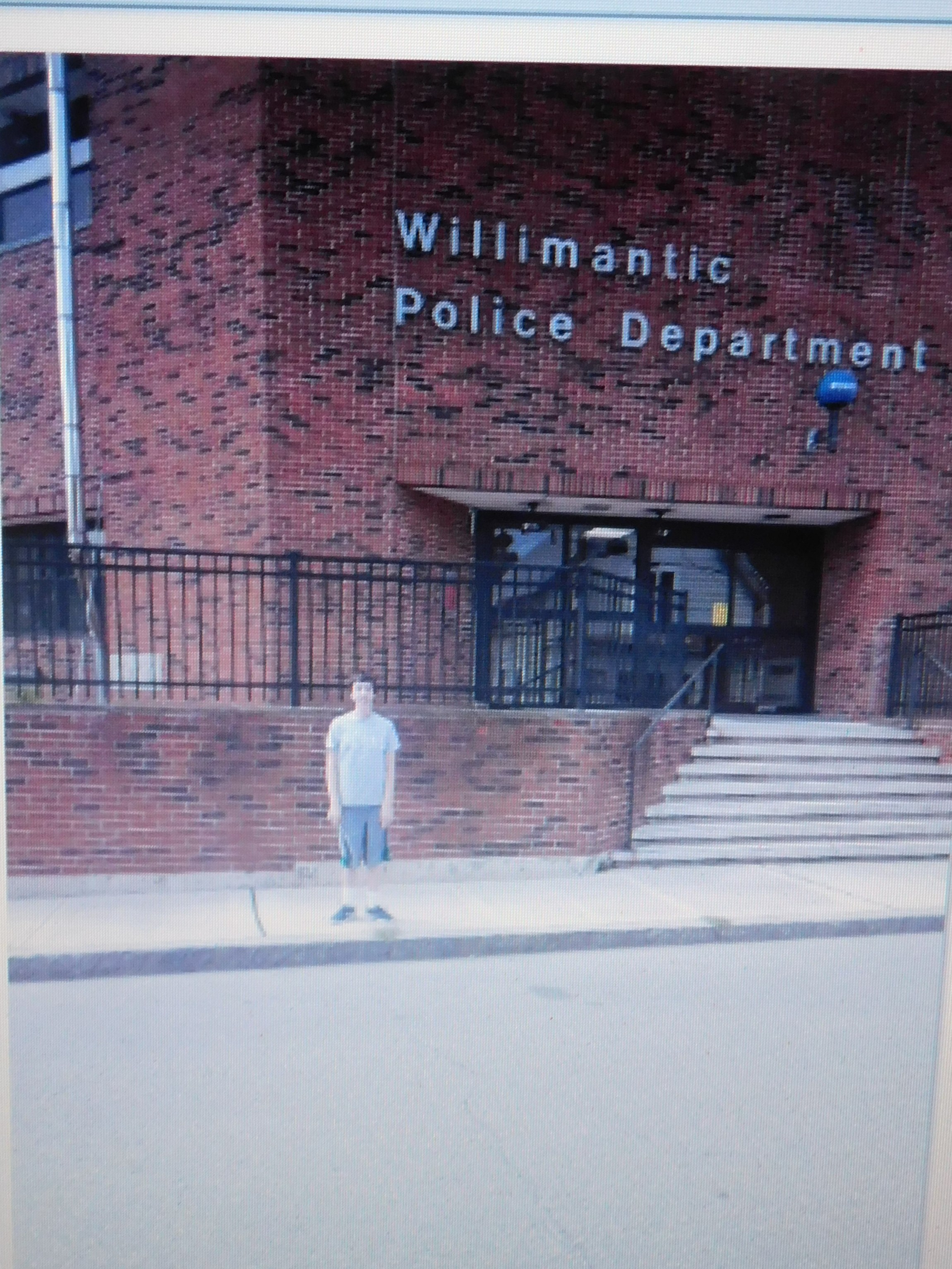 “Big Tom Roberts” was said to have walked the toughest beat in the city for the Willimantic Police Department during the early part of the 20th Century. His great-great-great grandson, Preston Bennett, proudly stands in front of the present day WPD. Photo courtesy of Lance Bennett 8/19/2018