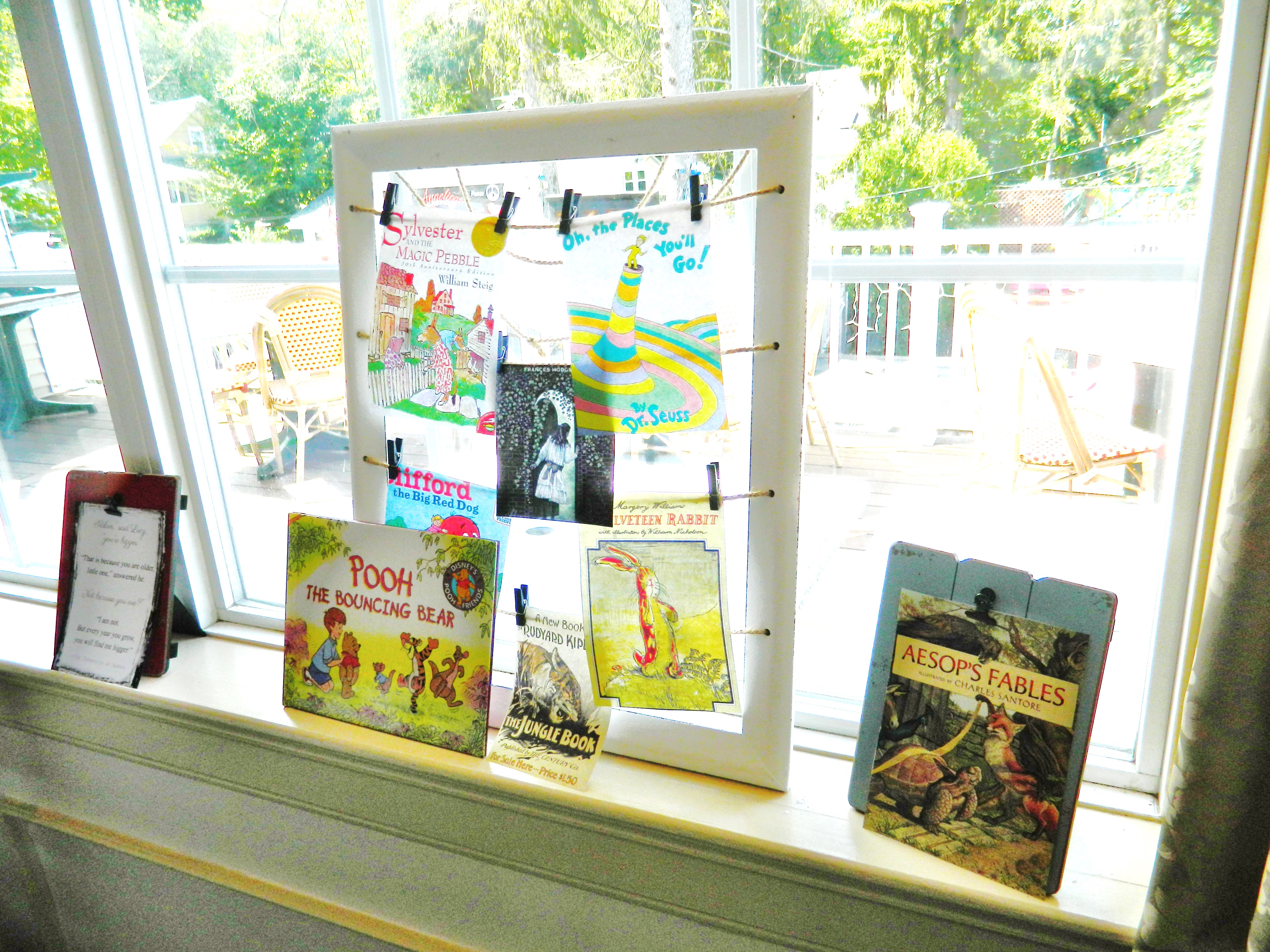 She also enlisted help from Michelle’s friends and family to create table center pieces using their favorite children’s books: Erica ~ Good Night Moon; Haley ~ The Very Hungry Caterpillar; Kathleen and Maureen ~ Madeline; Liz and Brooke ~ Beatrix Potter; Toni ~ Alice in Wonderland; and Coleen ~ Winnie the Pooh.