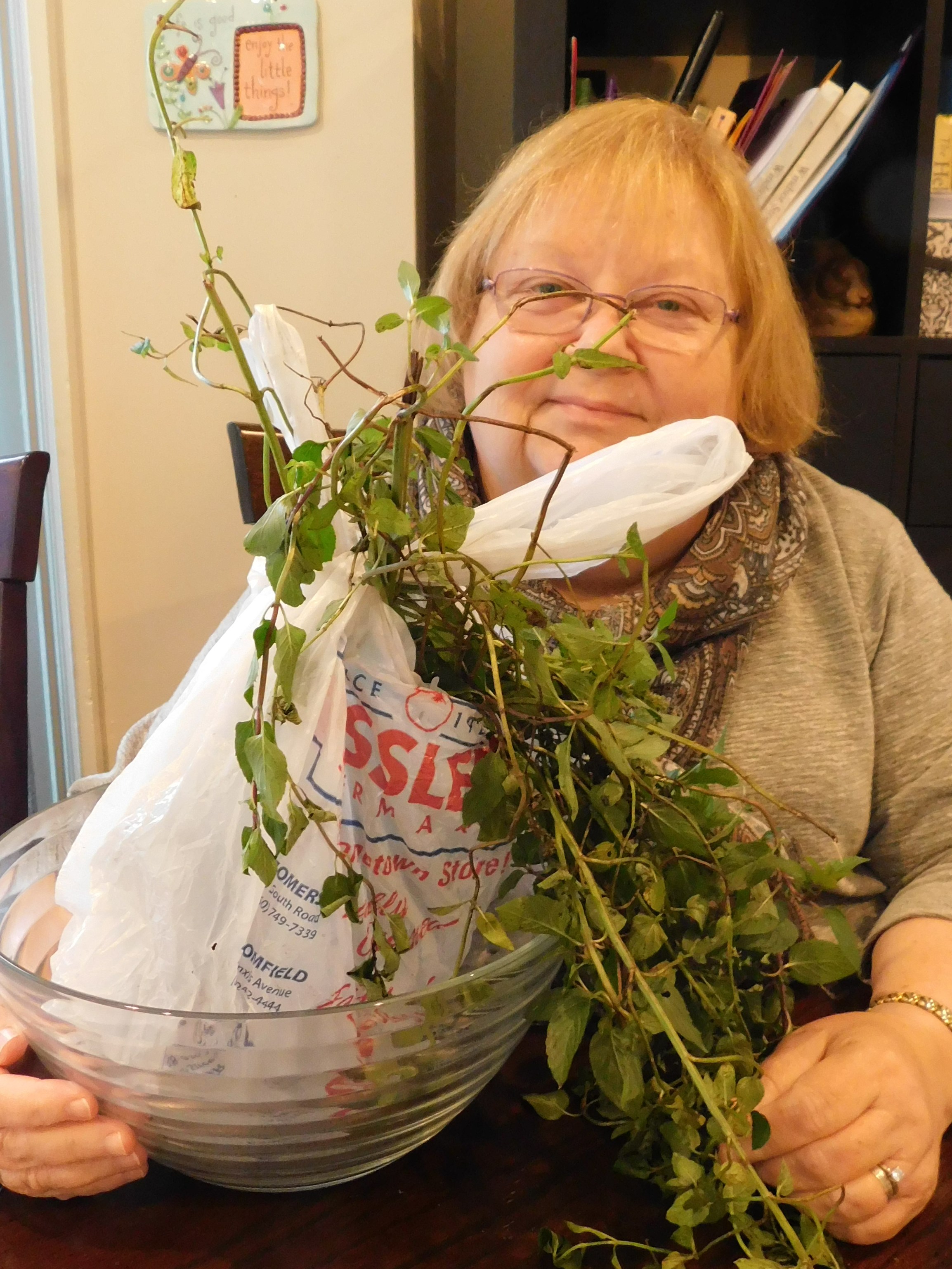 I plan to “plant” a portion of the stems with soil in a pot for my Potter’s’ Bench on the back patio. Also, I have placed a few stems in a small vase indoors. Fragrant and pretty too.